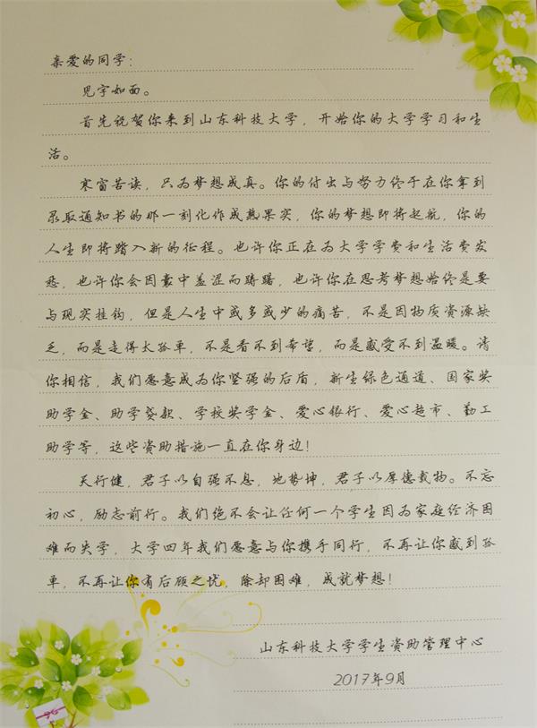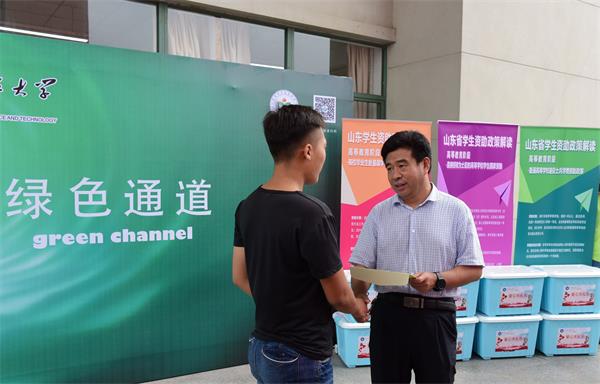 时维九月,序属三秋。一把雨伞为你撑起一片晴天,一张饮水卡为你送上一杯热水,一个背包为你装满知识的行囊,一本资助政策问答手册随时解决生活难题,两本爱心图书给予心灵的慰藉。不论你来自何方,不论你是谁,既然来到了山科大,我们就愿意做你坚强的后盾,决不让任何一个学生因家庭经济原因而失学。绿色通道的开通,确保了家庭经济困难学生顺利入学,我们将继续贯彻落实好国家资助政策,努力做好精准资助,让国家和学校的关怀帮助到每一位需要帮助的学生。(通讯:张婕  颜莹莹)