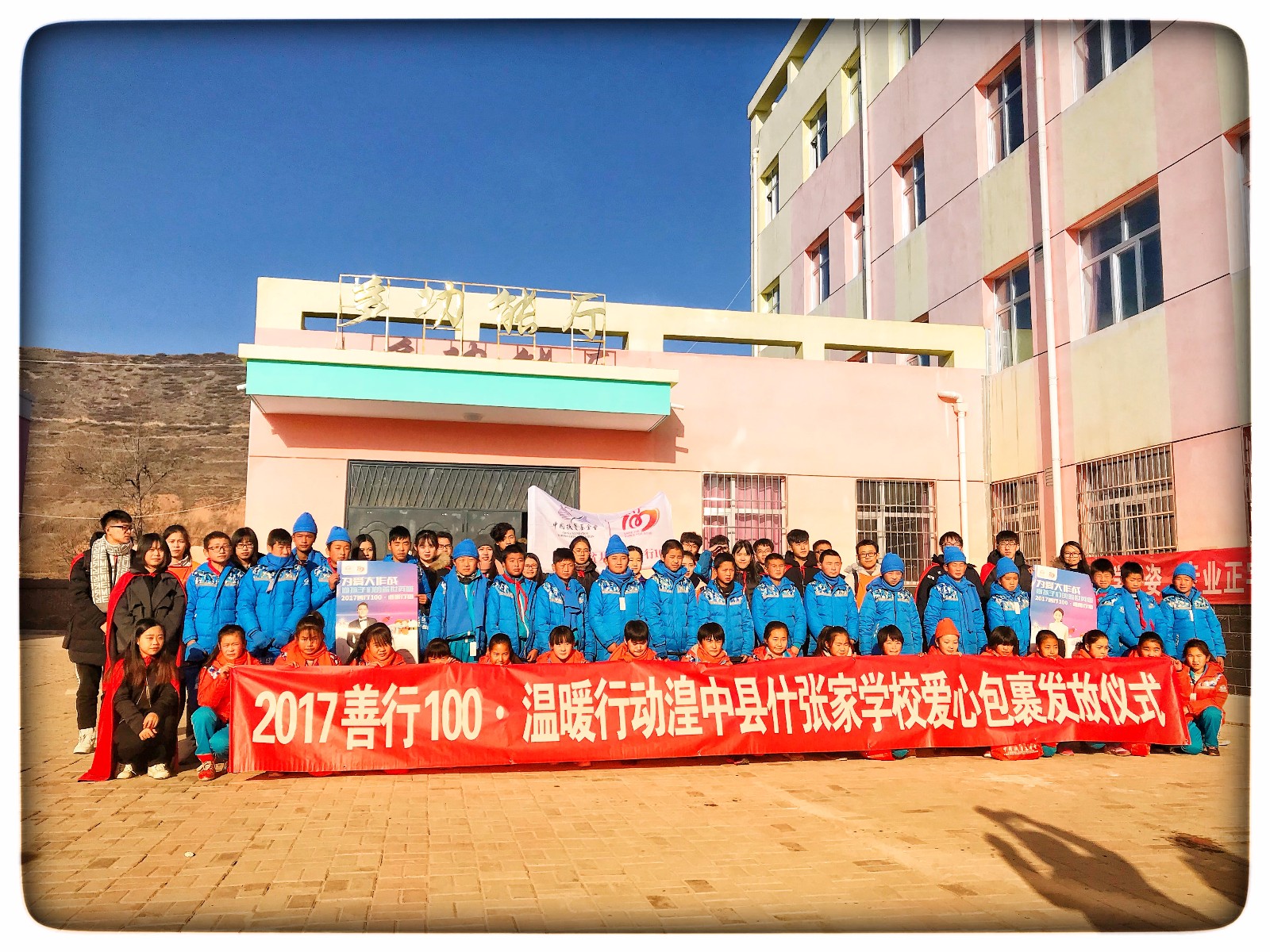 早上8点半,各高校公益社团负责人及志愿者们在西宁市集合完毕,在中国扶贫基金会的工作人员带领下,路途辗转,经过一个半小时的车程以后到达什张家学校。首先在什张家学校的报告厅举行“2017善行100——温暖行动什张家学校爱心包裹发放仪式”,主持人介绍与会嘉宾,在参会领导发言后,受益学生代表发言表达对志愿者的衷心感谢,紧接着志愿者们为部分受益学生发放温暖包,并为学生们穿上羽绒服,带好围巾手套。当穿着崭新温暖的羽绒服,每位学生的脸上都露出了幸福的笑容。