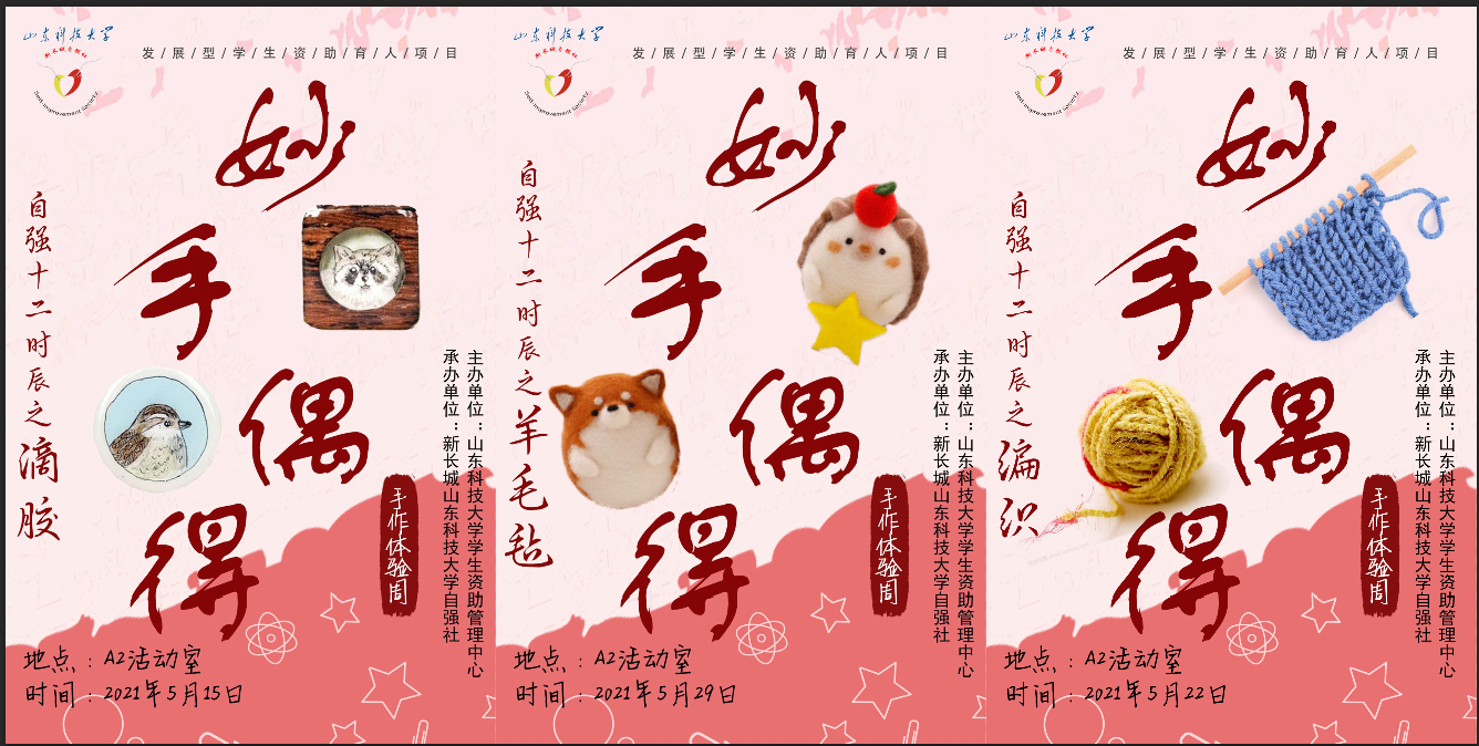 为贯彻落实“以美育人,以文化人”的要求,提升学生动手实践能力,丰富校园文化活动内容,提高学生审美能力和人文素养,学生资助管理中心于5月顺利开展“趣味水晶,创意滴胶”、“美在青春,编织人生”、“指尖艺术,毛毡企划”为期三周的手工创意体验活动。