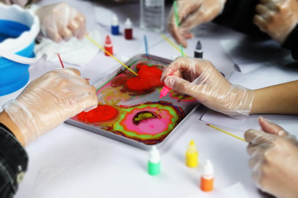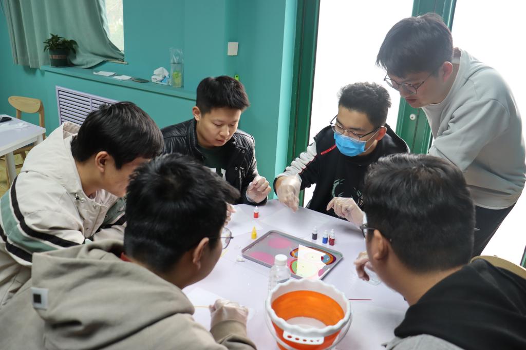 活动邀请水拓画爱好者同学们讲解了水拓画的相关知识及制作技巧。水拓画,是别具诗情画意的水上丹青,利用油脂颜料浮于水面的原理进行创作。大家纷纷发挥奇思妙想,笔尖轻轻地游走,颜料随水波层层晕染,缤纷的纹路图案在水波涟漪中曼妙流动,将纸张轻覆水面,独一无二的魅影自此留驻在这场活动中,同学们自由舒展怅然释怀,体味水拓画的魅力,感受颜色在画液上自由的舒展。一滴滴颜色,一圈圈花纹,一道道轮廓,染出了青春的活力。