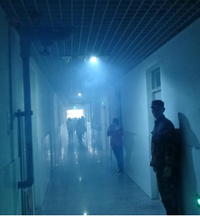 整个演练分为应急疏散演练、安全知识培训、灭火器使用三部分。首先在学生公寓楼A15号一层走廊模拟火情发生,公寓物业消防控制室工作人员迅速反应,到现场确认火情后,启动声光报警和自动排烟系统,及时电话报告领导火灾险情并拨打校消防电话。百名学生两分钟内全部疏散完毕。