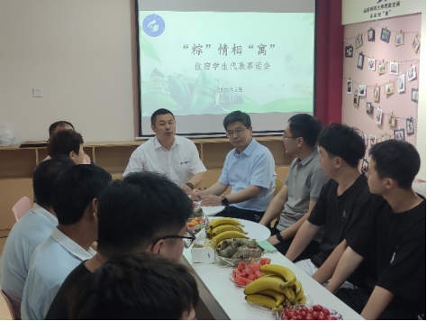 会上,学生反映着有关学生公寓供电时长、空调安装、不文明行为认定、设施维修等诸多方面的疑惑和建议,公寓管理服务中心老师于海峰和丹田物业主任张建波为同学们一一解答回复。住宿学生代表付海鑫开心地说:“今天的茶话会让我找到在家过端午节的感觉,不但吃着物业主管赵阿姨亲自煮、亲手剥的粽子,而且还有老师们和蔼细致地解答回复着我们的疑惑和诉求,体验感十足。”