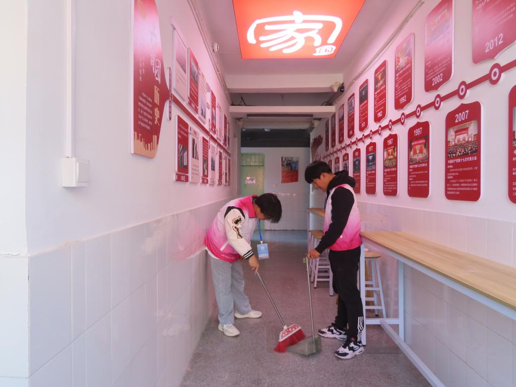 学生公寓学生监督管理委员会带领同学们进入学生公寓楼对展板、门禁等公共区域及公寓楼外环境进行彻底清扫,同学们热情高涨,提前准备好清洁工具,认真细致地打扫每一个区域,干劲满满,氛围感染了许多同学,大家都自发投入到清扫公寓的队伍中去。用时一个下午,同学们完成了27栋公寓楼的卫生清扫。