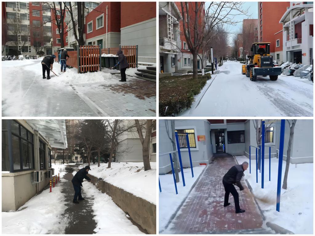 人员提前返岗,开展除雪工作。组织丹田物业学生公寓项目工作人员于2月18日提前返岗,面对突如其来的大雪天气,为保证返校学生的安全出行,学生公寓工作人员化身扫雪突击队,紧急开展除雪工作,连日连夜铲冰除雪、清扫道路,为学生公寓开辟一条整洁平稳的行走线。