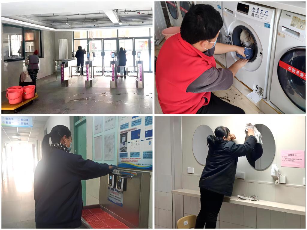 开展卫生清扫,恢复服务项目。开展学生公寓内外卫生大清扫,对门厅、地面墙面、门窗、标识标牌、扶手护栏、卫生死角等全面彻底清理;配合水电暖管理办公室有序恢复学生宿舍、暖供应做好学生公寓直饮水、淋浴热水、空调、洗衣机等生活服务设备清洁和维护,为学生返校后正常生活做好充分准备。