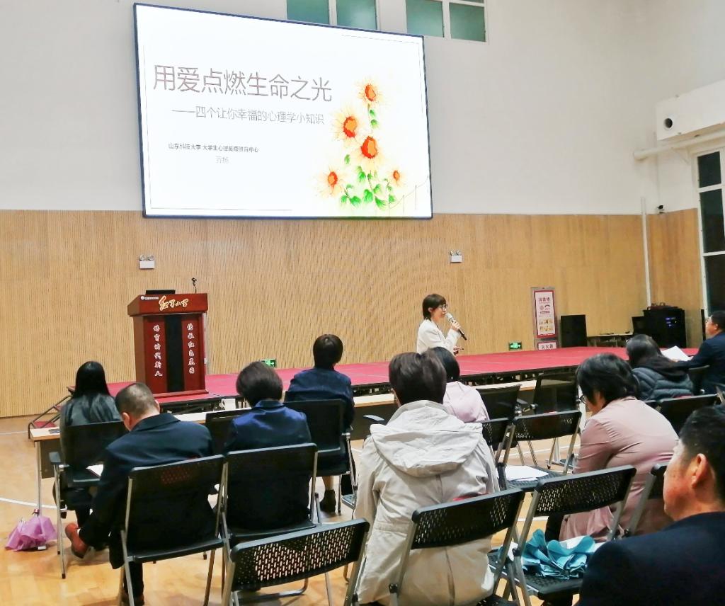 5月14日,在青岛市红军小学的邀请下,我校大学生心理健康教育中心乔杨老师为红星小学各位老师开展了“用爱点燃生命之光”心理主题讲座。