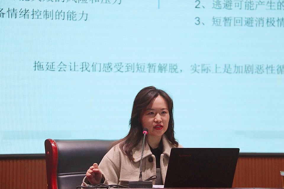 本次讲座邀请了国家三级心理咨询师、大学生心理健康教育中心兼职心理咨询师赵铭老师,围绕“与‘拖延’对话——同学们,你们到底在等什么?”这一主题,从拖延的本质、拖延的成因以及解决拖延的办法三个方面展开讲座。赵铭通过播放“糖果实验”视频让同学们直观地了解延迟满足与及时满足的概念,指出拖延背后的情绪来源,并通过分析导致“完美主义”现象的心理原因,点明拖延症的成因是恐惧和逃避心理。赵铭指出:“拖延的本质是情绪问题,拖延会让我们感到短暂的解脱,实际上是加剧恶性循环的原因。”因此,解决拖延症的办法便是按计划做事,拒绝浪费时间。