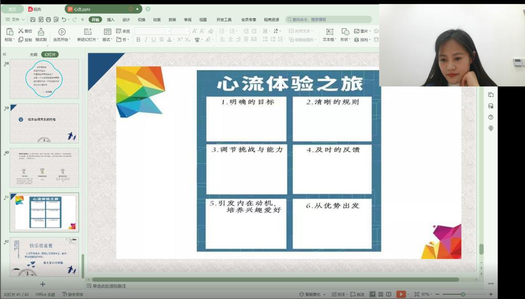 讲座围绕“巧用心流,体验沉浸式快乐”这一主题展开。姜振丽首先使用绘画的方式让同学们初步体验心流,进而引出心流的概念及其特征。之后又通过心流体验图与同学们一起探究了心流产生的条件,并以生活中的真实案例讲解心流体验是如何产生并维持的。最后,姜振丽向同学们讲解如何制定一份“心流体验”计划书,帮助同学们提升自我管理的能力,让心灵得到及时的滋养。