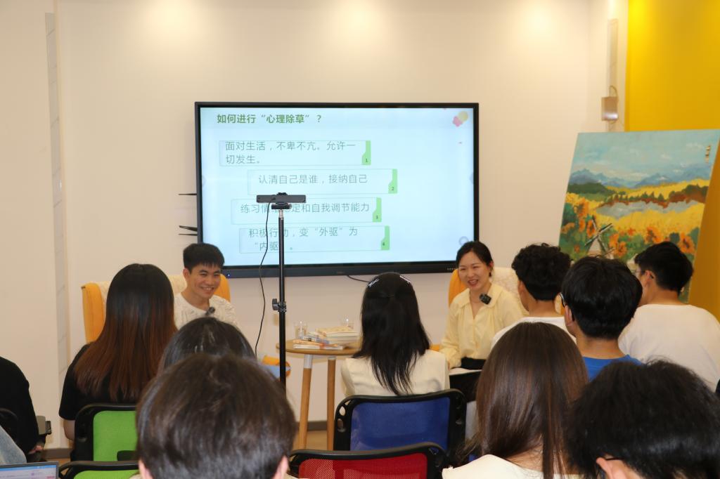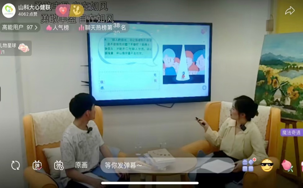 本次活动由大学生心理健康教育中心赵铭担任主讲,围绕“负面情绪调节”这一话题,与大学生嘉宾展开了讨论交流。“无聊来源于紧绷和内耗,大学生可以培养对自然和社会的深度理解,通过与世界的情感共鸣来化解负面情绪。”赵铭以“无聊”这一大学生常见现象为切入点,展开讲解了负面情绪的心理根源,并介绍了心理调节的有效方法。紧贴生活的对话内容,引发了同学们的思考和共鸣,同学们纷纷在现场和直播间与赵老师交流互动。来自安全学院的刘潇表示:“近期要考试了,焦虑和压力接踵而至,内心十分烦躁,老师的讲解和开导让自己受益匪浅,有了久违的松弛感。”