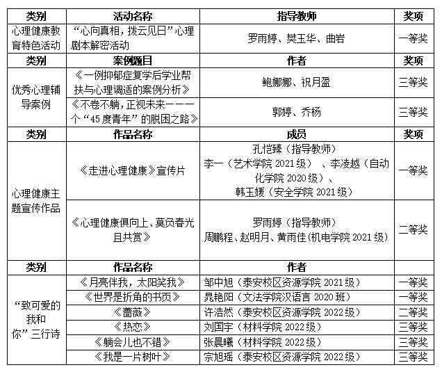 近日,山东省高等学校思想政治教育研究会、大学生心理健康教育专业委员会公布了2023年山东省高校心理健康教育月评选展示活动结果。经过专家评审,我校获一等奖4项、二等奖2项和三等奖5项,获奖数量和质量再创新高。
