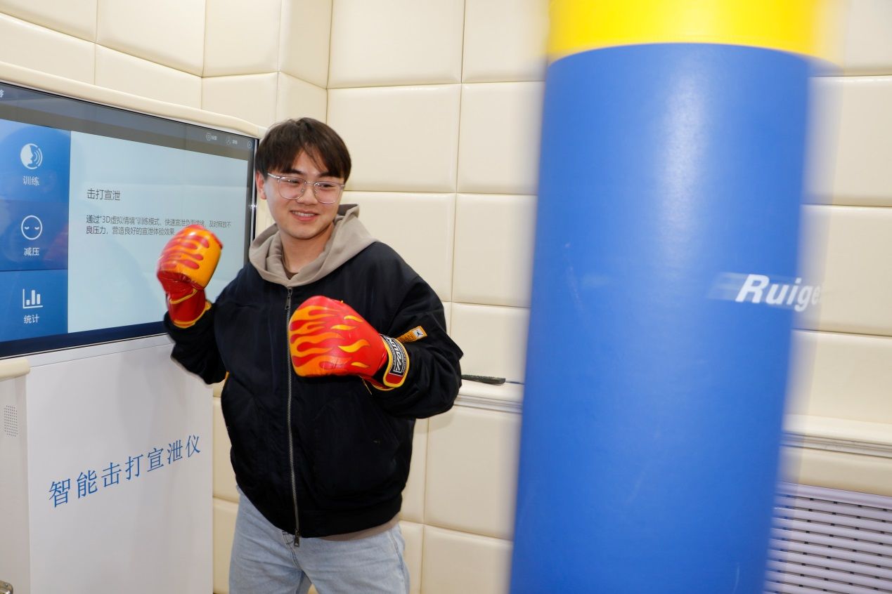 同学们在指导下体验智能击打宣泄仪和VR心理放松系统