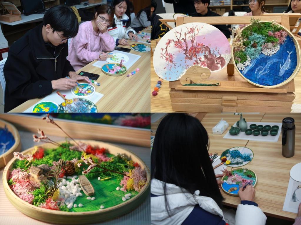 “冬季景色萧瑟,我想定制一个DIY小活动让同学们发现生活的乐趣无处不在。”周静宜的想法得到了同学们的热烈回应:同学们将苔藓、小船、小桥等材料粘贴在画板上,涂上喜欢的颜色,构造出一幅幅美丽大方、精美典雅的苔藓画;有的同学选取不同的石膏模板进行创作,将不同的颜色覆盖在模板上,赋予石膏盘、石膏娃娃独一无二的色彩和纹样;喜爱中国传统元素的同学,使用干花、胶水、丙烯颜料等材料,通过裁剪、贴花、绘画制作出一把把精致的古风团扇。一整个下午,同学们开心的笑声和精美的作品成为了冬季里最快乐的景象。“一双手、一下午,看到作品的那一刻,真正理解了每个人都是自己生活的艺术家。”测绘学院的刘畅同学自豪的感叹。