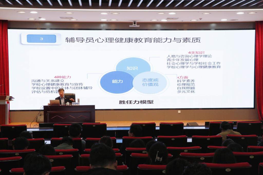 靳凯作总结。他表示,专家的讲座生动而又富有内涵,严谨而又不失风趣,阐述清晰,分析透彻,有利于加强我校学生工作队伍建设,提升辅导员心理健康教育工作水平。他强调,心理健康教育工作是辅导员的重要工作职责之一,贯穿思想政治教育的全过程,辅导员要坚持育心与育德相结合,加强人文关怀和心理疏导,拓宽工作思路,创新工作方法,全面提升心理危机干预能力和谈心谈话水平,着力培养大学生自尊自信、理性平和、积极向上的健康心态。(通讯员:岳姝伶;摄影:周月晗)