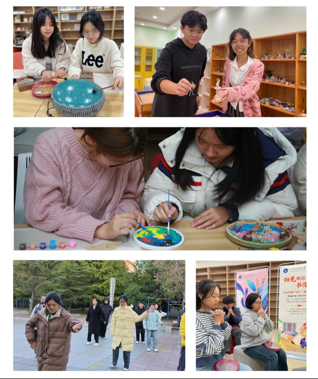 该活动通过“课程式菜单”“成长式体验”的创新方式,推出28项趣味互动式心理活动,确保周周有活动、每天各不同:同学们在周一“关爱计划”中体验VR心理放松系统、心理沙盘等心理辅导设备;在周二的“乐活计划”中动手调制咖啡等中西饮品;在周三的“友伴计划”中欣赏诗歌、结交新朋;在周四的“健心计划”中户外游戏、舒展身体;在周五的“自信计划”中绘画涂鸦、宣泄情感;在周六的“初心计划”中观赏佳作、交流感悟;在周日的“减压计划”中体验声波的疗愈。“悦享空间是我在图书馆里最爱的去处,在这里总能遇到有趣的活动和有趣的人。”化工学院张正傲同学这样描述他对活动的喜爱。