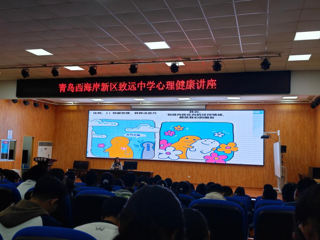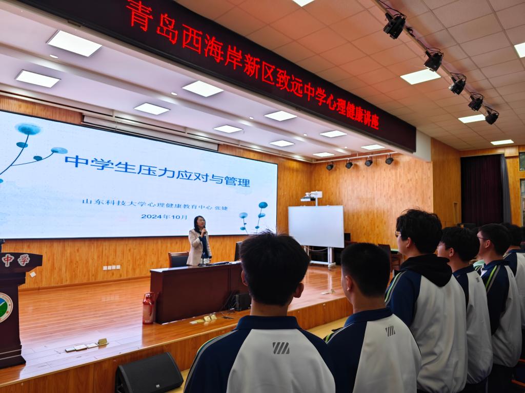 10月24日,大学生心理健康教育中心张婕赴青岛西海岸新区致远中学,为学校300余名高中生开展以“中学生压力应对与管理”为主题的心理健康知识讲座。