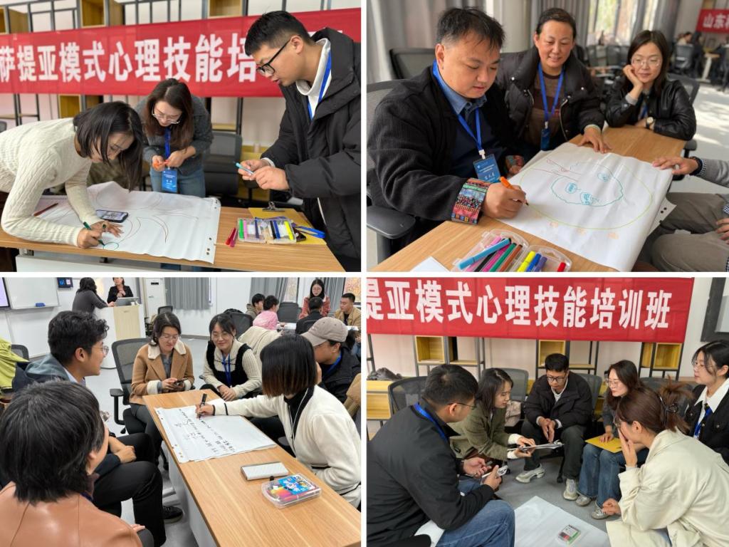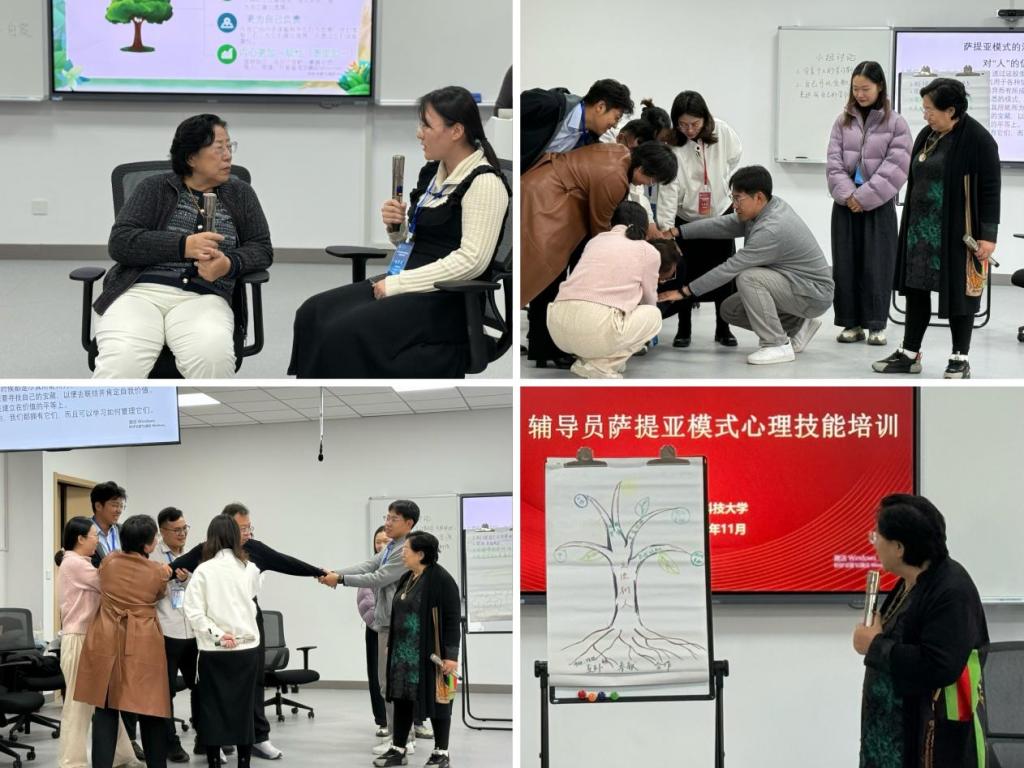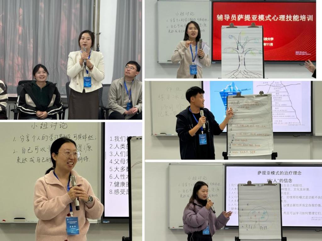 培训班历时两天,采用“理论讲授+体验互动”的模式,系统性的讲授了萨提亚家庭治疗技术的基本理论和主要技术,吴教授运用情境讲解、案例分析等教学方法,生动地展示了萨提亚模式中的冰山理论和沟通姿态;全体学员认真学习、投入觉察,从“破冰游戏”环节中互相了解、打破隔阂,在“小组讨论”环节中剖析个体内在心理系统、练习有效倾听,到“雕塑现场”领悟共情力量、体会自我成长的资源与力量,参训学员在互动实践中不仅提升了心理工作技能,更实现了自我成长与育人能力的双重进阶。