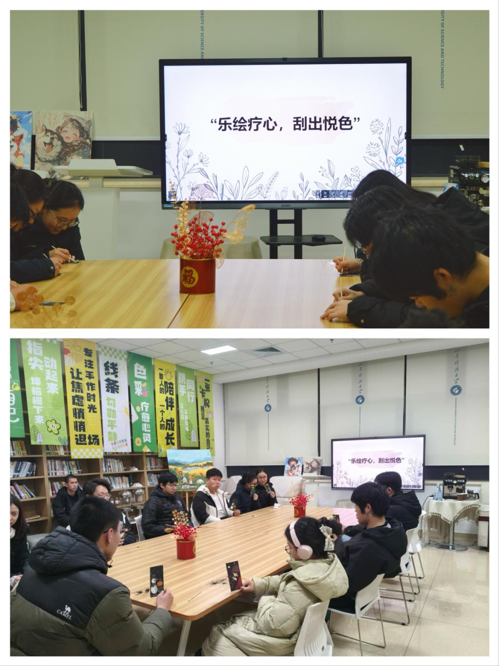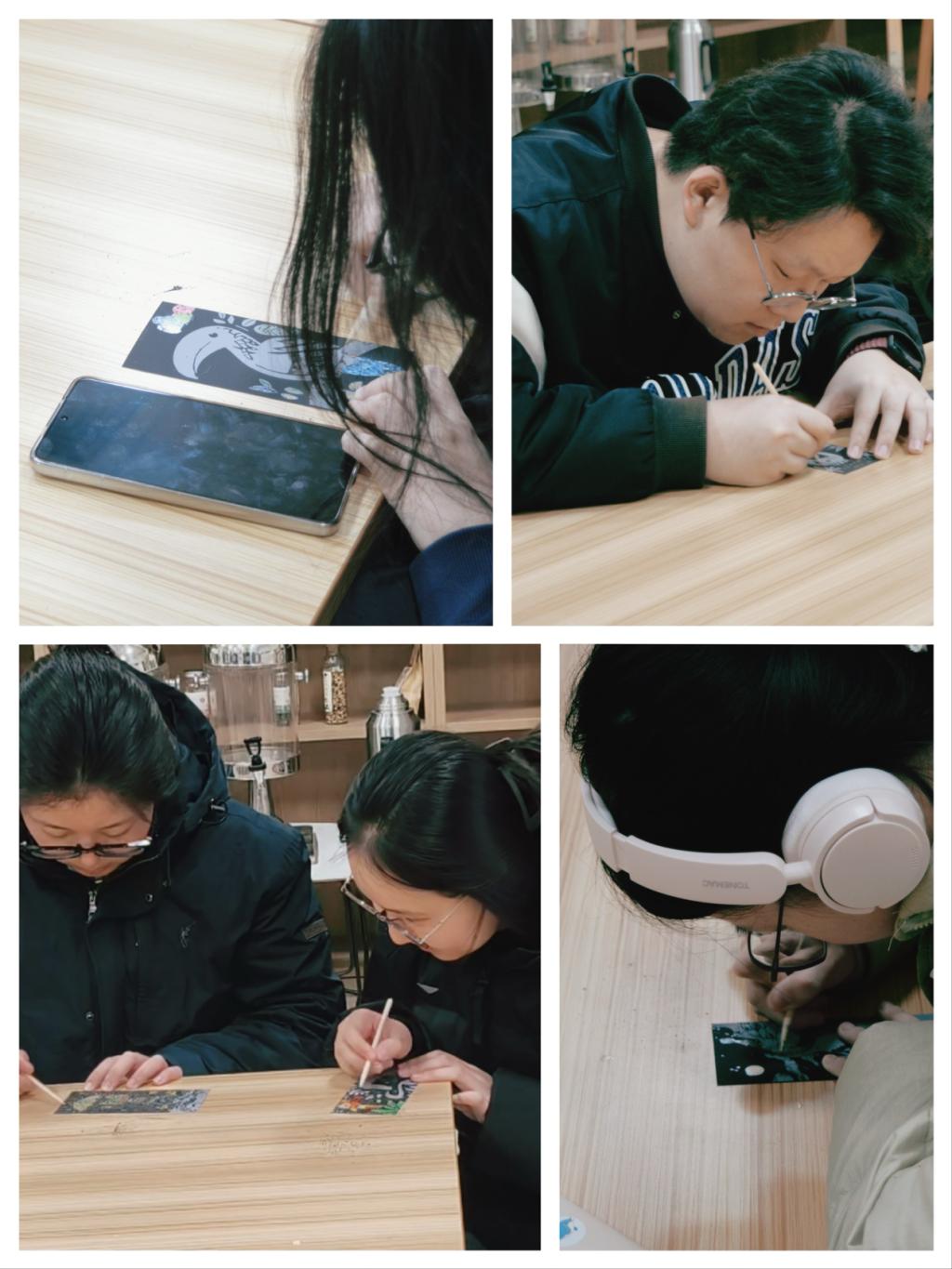 活动以“心灵随律动,色彩指尖生”为主题,参与同学一边聆听舒缓或轻快的音乐,一边使用刮画笔在特制彩板上进行创作。随着旋律流淌,同学们在刮绘中逐渐释放情绪,每一道线条与每一片色彩的浮现,都成为内心状态的温柔外化。现场氛围专注而宁静,大家沉浸在视听融合的创作过程中,体验艺术表达所带来的情绪疏导与心灵抚慰。来自安全与环境工程学院的学生孙祎乐说“听着音乐刮画,像把压力也一点点刮走了,很治愈。”