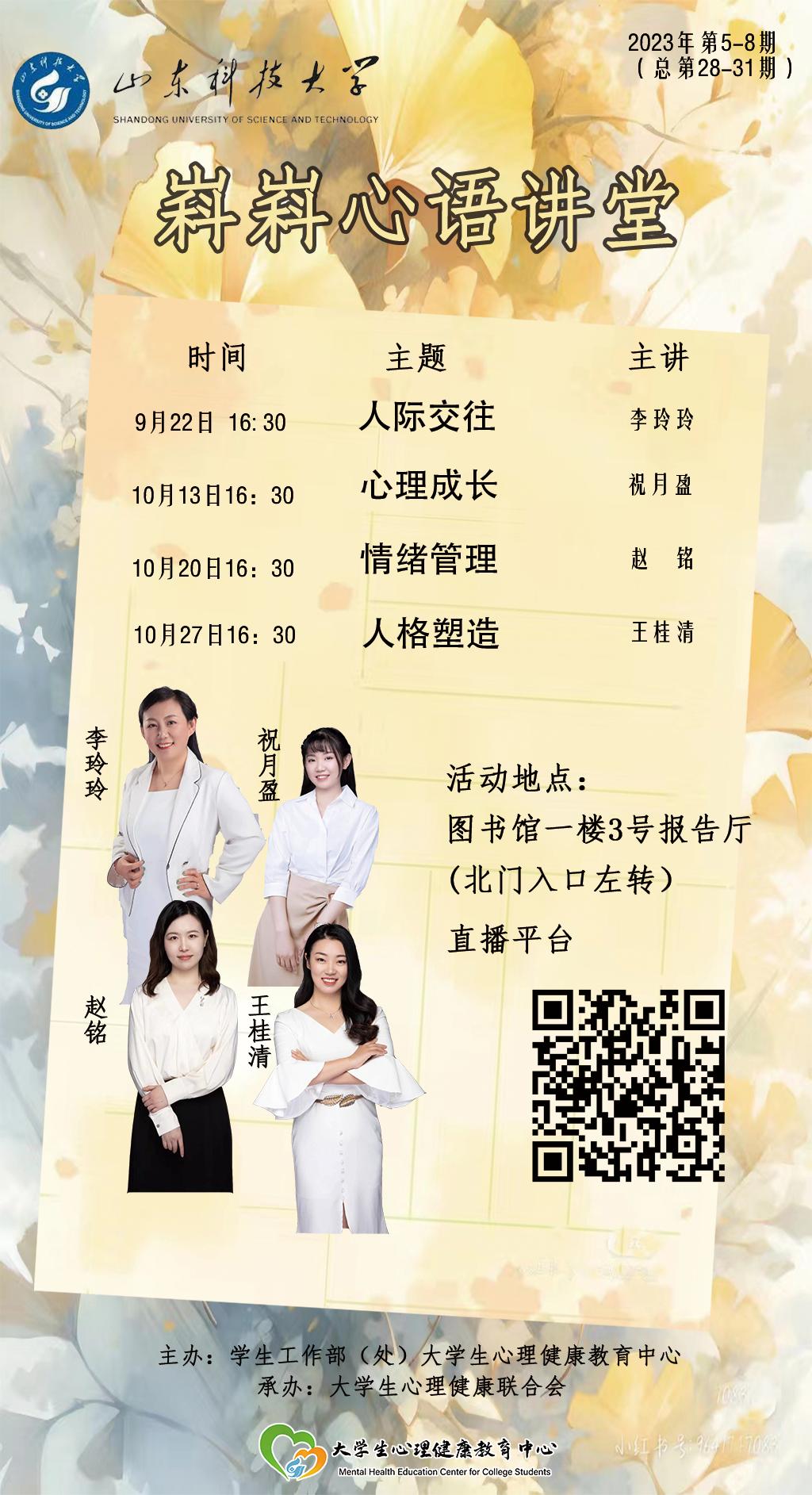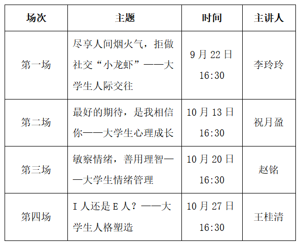 为进一步普及心理健康知识,提升大学生心理应对能力,根据我校《关于开展“阳光健心青春圆梦”心理健康主题教育月活动的通知》学工部(处)函〔2023〕31号,决定举办2023年秋季学期嵙嵙心语讲堂,现将有关事项通知如下: