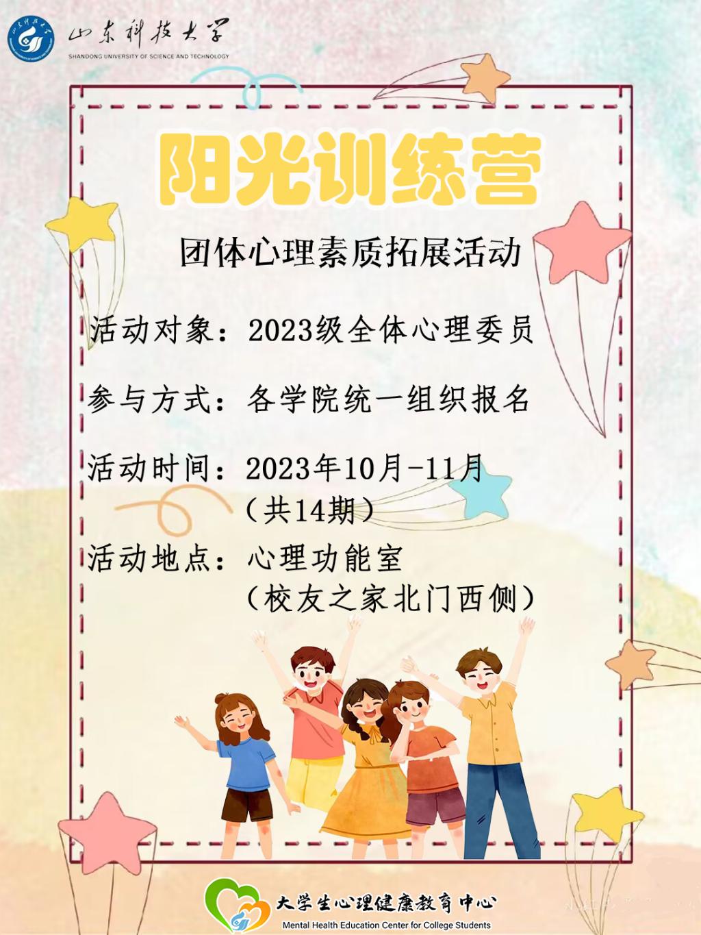 为促进我校“校—院—班—宿舍”心理健康四级工作体系的有效开展,培养班级心理委员的朋辈心理服务能力,根据我校《关于开展“阳光健心∙青春圆梦”心理健康主题教育月活动的通知》,决定举办2023年“阳光训练营”团体心理素质拓展活动。现将具体事宜通知如下: