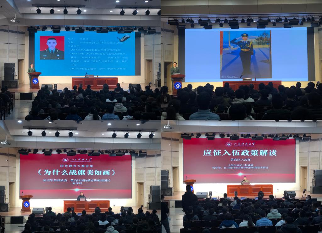 黄岛区taptap点点官方入口讲师团团长朱序科作“为什么战旗美如画”taptap点点官方入口专题讲座,从“军强国安”“重压如山”“改革强军”“爱党爱军”“报国参军”五个方面分享了自己参军经历与体会,鼓励大学生“参军报国正当时,热血军营献青春”。