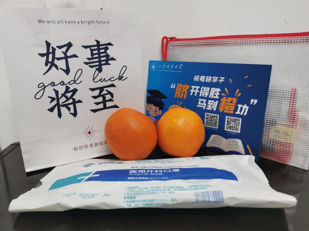 随后,武装部师生代表为考研学子们送上“考研加油包”,有寓意着“脐”开得胜、马到“橙”功的“脐橙”;印有大学生就业中心、刘老师聊就业二维码及联系方式的贺卡无声的传递着承诺——曾经你们保家卫国,今天学校助力你们成才发展!口罩、文具等实用物品,从细节处为同学们提供帮助;加油包印有“好事将至”“未来可期”字样,祝福大家在考研战场上,得偿所愿,心想事成!收到礼物的同学们既惊喜又感动,“没想到老师和战友们会亲自将礼物送到自习室,我一定会打起十二万分的精神争取最好成绩,不辜负学校、老师和战友们的鼓励与帮助”。