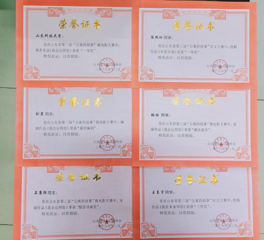 其中,我校推送的征文《幸甚至哉》(作者:陈艳玲)、《我在未来等你》(作者:王东宇)分别获得一等奖、三等奖;微电影《我会记得您》获得一等奖,刘岩获得“最佳编剧”奖、张恬获得“最佳演员”奖、石康颖获得“最佳导演”奖、刘伟娟获得微电影“最佳指导教师”称号;赵洋获评山东省2019年高校学生公寓管理工作“先进个人”称号。