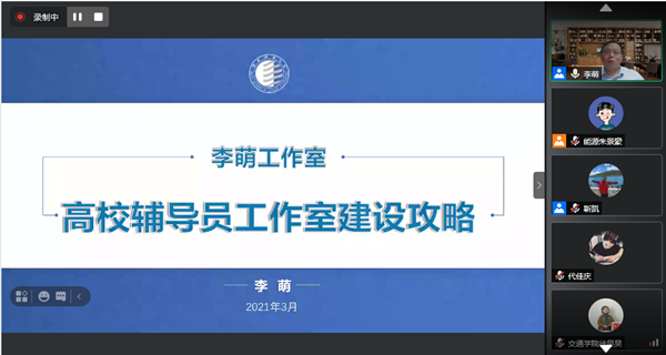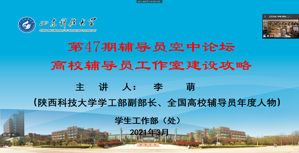 为做好辅导员工作室的建设与管理工作,进一步推动学校辅导员队伍专业化、专家化、职业化发展,提升大学生思想政治教育工作水平,打造我校大学生思想政治教育工作品牌,3月23日晚七点,学校举办第47期辅导员空中论坛,特邀陕西科技大学学工部副部长、全国高校辅导员年度人物李萌副教授在线给我校全体辅导员作“高校辅导员工作室建设攻略”讲座,会议由学生工作处副处长靳凯主持。