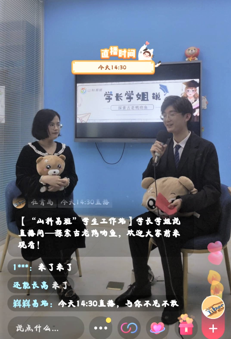 近日,山科易班学生工作站邀请了以第一作者身份发表论文成果——“发现了古鱼王国的新属种”的姜文瑜同学做客“学长学姐说”直播间,线上直播活动火爆,吸引了5800余学生观看,弹幕评论数共计660余条。