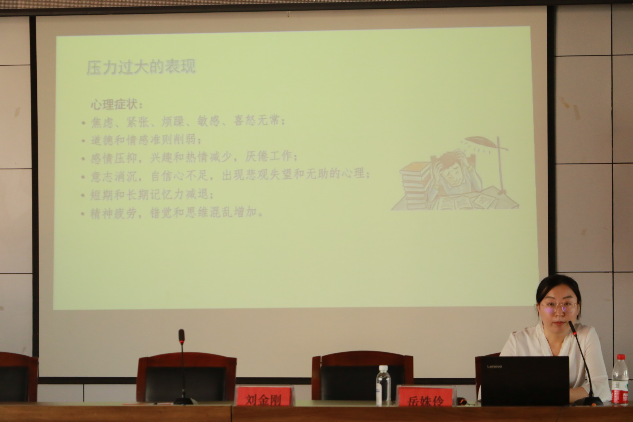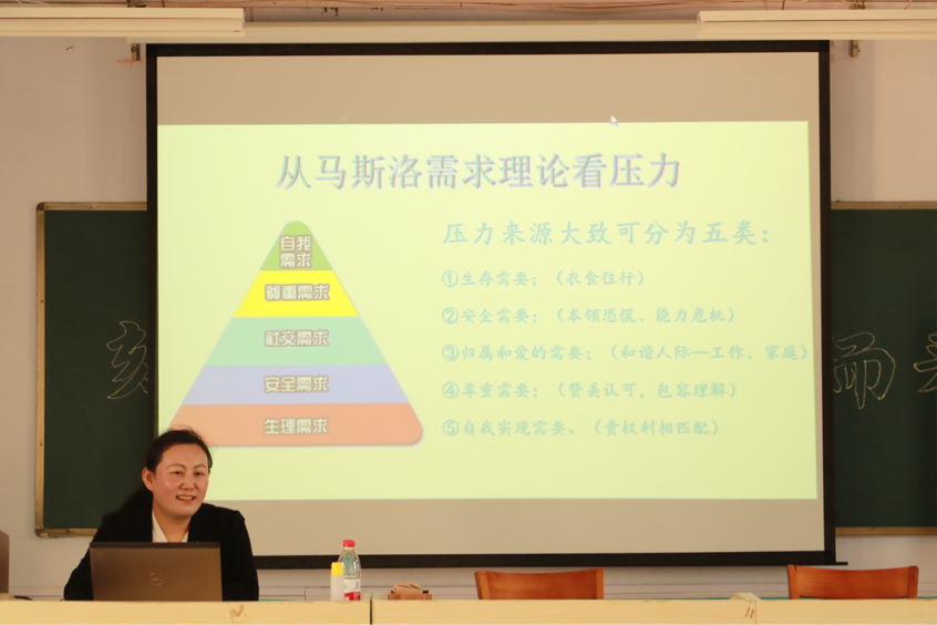 李老师围绕“教师职业幸福感”这一主题从多方面对教师职业幸福感进行讲解。一方面,李老师通过有趣的心理学小故事,生动形象的介绍了什么是压力,压力的来源,着重解释了为什么教师会倦怠,如何正确认识自己的压力;另一方面,李老师在前一方面的基础上,通过有趣的案例讲解,引导教师们释放压力。提出教师调整自我压力的3种方法:调整对压力的理解、学习心理调整策略、增强压力对抗能力。