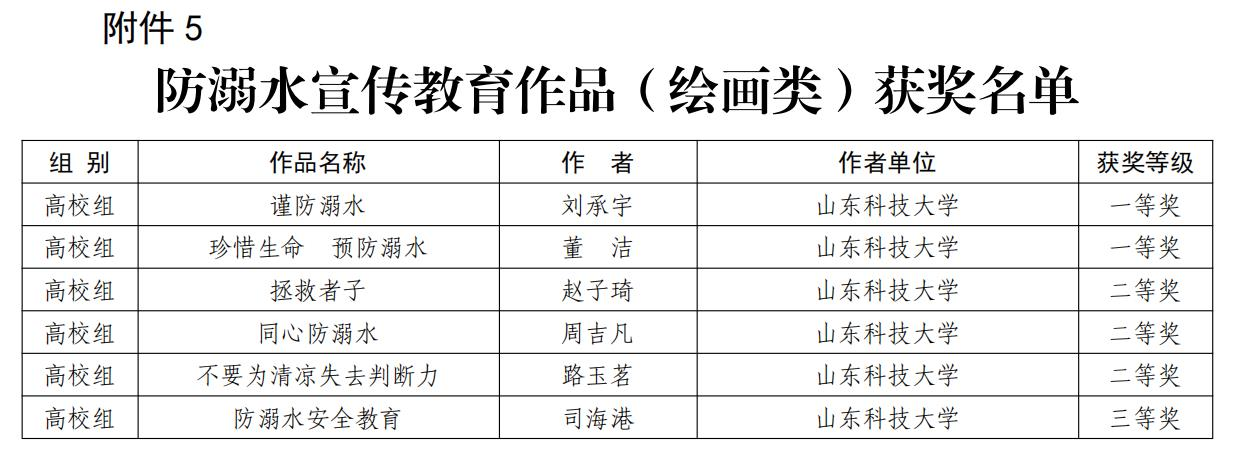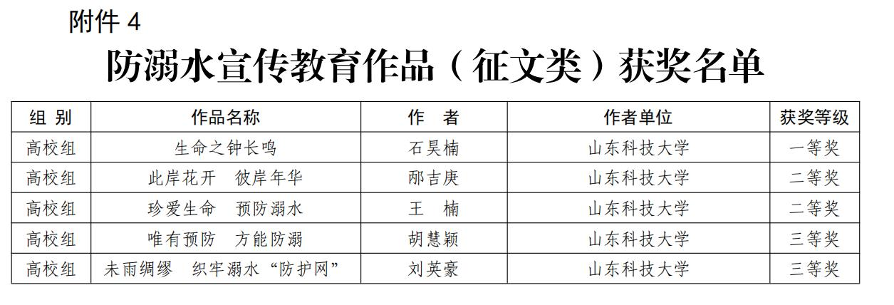 在高校组“同心防溺水”优秀安全宣传征文类作品评选中,我校安全学院石昊楠同学的作品《生命之钟长鸣》荣获一等奖,taptap点点体育邴吉庚同学的作品《此岸花开,彼岸年华》和艺术学院王楠同学的《珍爱生命,预防溺水》荣获二等奖,艺术学院胡慧颖同学的《唯有预防,方能防溺》和taptap点点体育刘英豪同学的《未雨绸缪,织牢溺水“防护网”》荣获三等奖;在高校组“同心防溺水”优秀安全宣传绘画类作品评选中,我校土建学院刘承宇同学的作品《谨防溺水》和海洋学院董洁同学的《珍惜生命,预防溺水》荣获一等奖艺术学院赵子琦同学的作品《拯救者子》、艺术学院周吉凡同学的作品《同心防溺水》和海洋学院路玉茗同学的《不要为清凉失去判断力》荣获二等奖,艺术学院司海港同学的作品《防溺水安全教育》荣获三等奖。