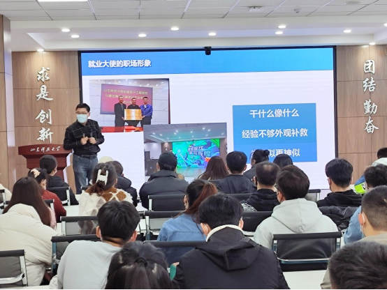 李雷从“选聘背景”“工作职责”和“服务他人,成就自己”三个方面介绍了就业大使的选拔程序、工作职责;同时以往期“大使代言”双选会情景为例,和大家分享了一些有效的工作技巧;最后,向大家分享了优秀就业大使代表的工作经历,鼓励大家珍惜锻炼机会,不断努力提高自身本领,为未来的职业发展打下坚实的基础。