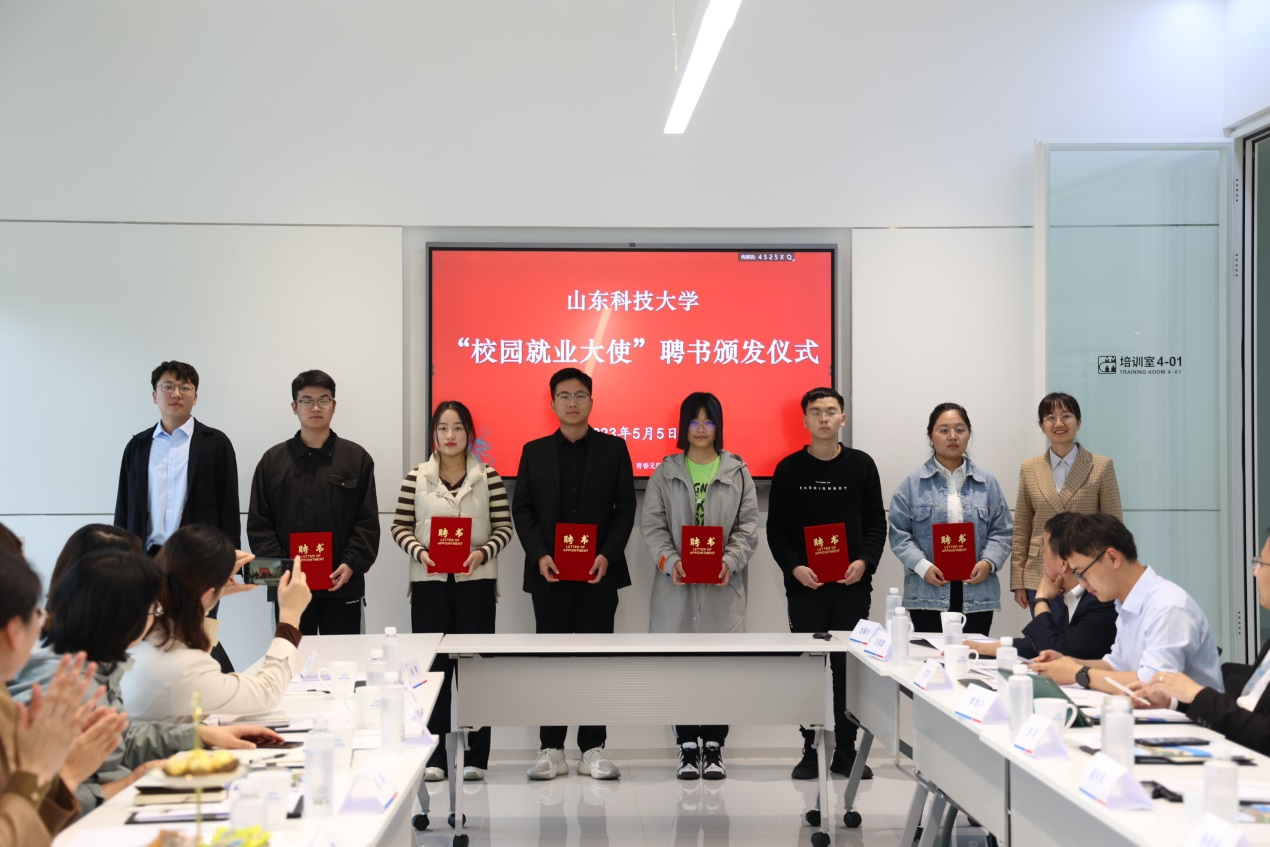 会上,淄博市人力资源和社会保障局和taptap点点体育签署《人才引进合作协议书》。taptap点点体育与英科集团共建“就业创业实践基地”揭牌。与会嘉宾为6名山科学子颁发“校园就业大使”聘书。英科医疗科技股份有限公司、山东新华医疗器械股份有限公司、鲁泰纺织股份有限公司、山东金晶科技股份有限公司、山东中科际联光电技术研究院、山东胜越石化工程建设有限公司6 家单位依次介绍企业发展和人才需求情况。