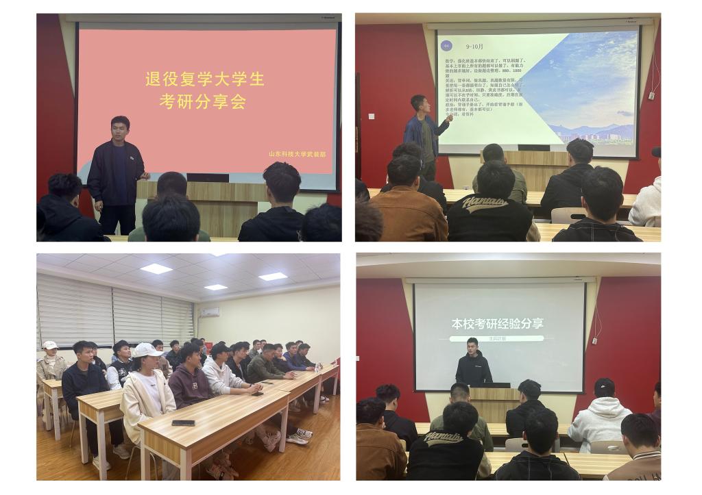 为帮助退役大学生做好个人职业规划,了解考研现状,充分实现高质量就业,4月25日,校武装部组织举办退役大学生考研分享会,2024届退役毕业生能源学院王帅良、交通学院李松霖、计算机学院王子越、艺术学院高志成作为分享人参加此次活动。