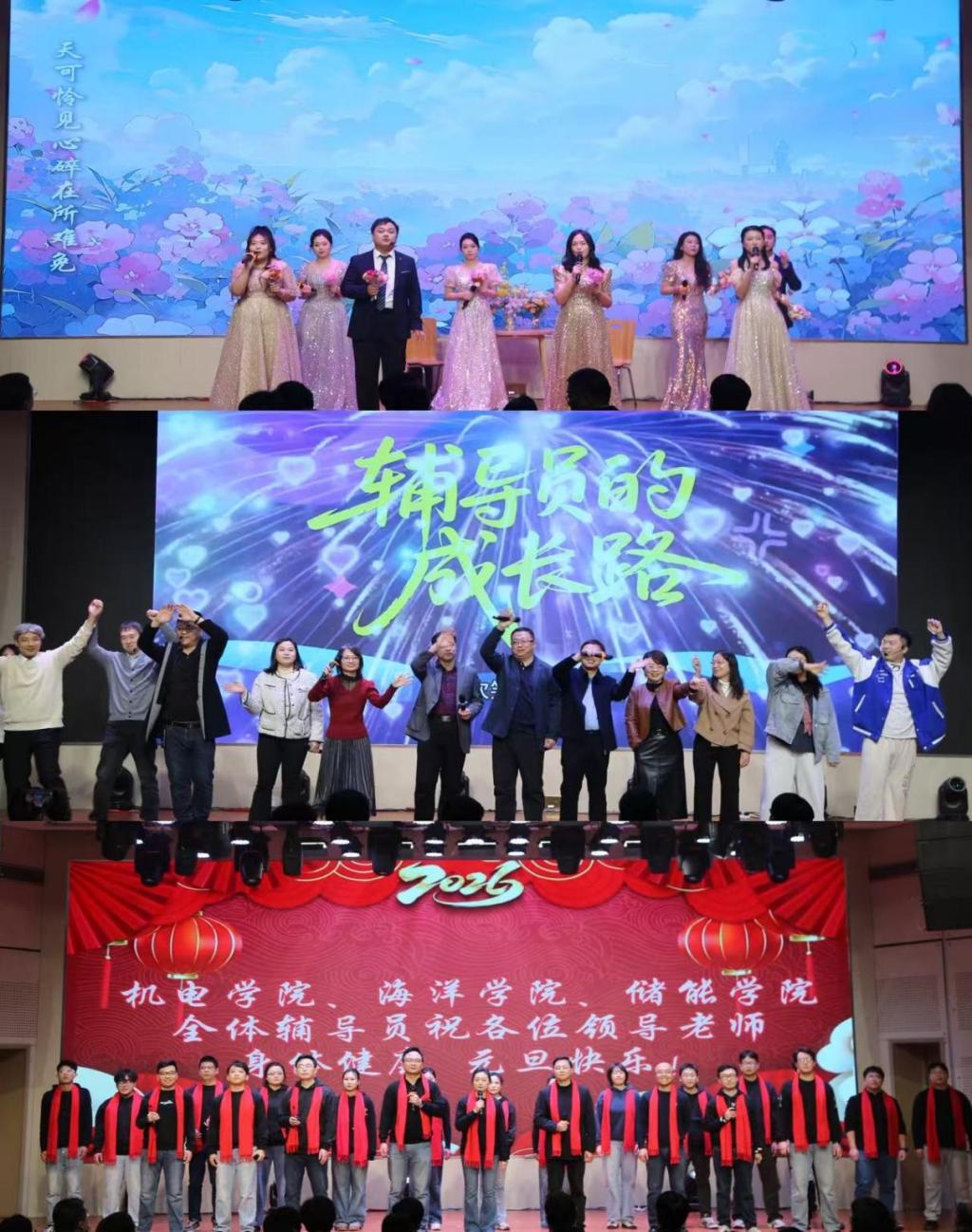 活动伊始,诸葛福民发表致辞,他高度赞扬了辅导员队伍过去一年在学生思想引领、学业指导、成长助力等方面的坚守与辛勤付出,并对未来的工作寄予殷切希望,并为大家送上美好的新年祝愿。随后,晚会围绕“同心、同行、同梦”三个篇章展开,节目精彩纷呈,气氛热烈温馨。