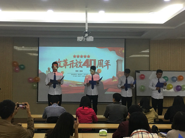 为庆祝改革开放40周年,进一步弘扬爱国主义精神,践行社会主义核心价值观,热情讴歌改革开放的伟大成就。10月19日晚,数学学院举行“献礼改革开放40周年,红色诗歌朗诵比赛”,比赛由研究生会承办,数学学院全体18级研究生参加了比赛。