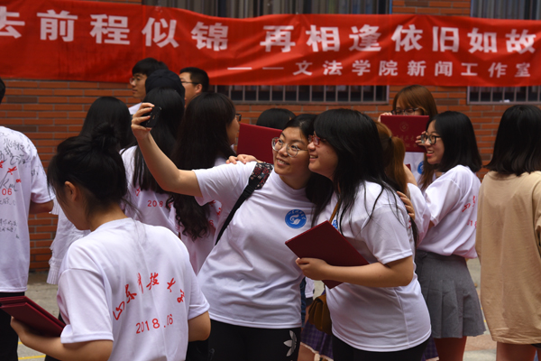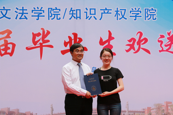 院长孙法柏为毕业生一一颁发毕业证书并合照留念。同学们与老师互送祝福,共忆美好的校园生活,在会场久久道别,不愿离去。长风破浪会有时,直挂云帆济沧海。文法学院388名毕业生带着老师们的谆谆教诲和美好祝愿,带着四年来的欢声笑语和美好回忆,走出校门继续追寻自己的梦想。腾飞吧,文法学子,毕业只是人生中的新起点,愿此去前程似锦,再相逢依旧如故。(耿祎晴 娄倩倩)