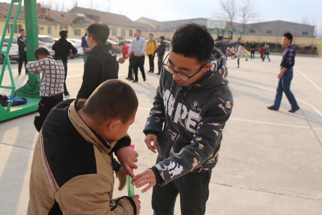 下午两点,晨星特教团一行26人携带着孩子们的新年礼物,抵达西海岸新区特殊教育中心。活动伊始,特教中心李晴老师就孩子们的具体情况向同学们进行了详细的介绍,并叮嘱了一些活动中需要注意的事项。随后26人分为六组进班开展主题志愿服务活动:唱歌、跳舞、画画……教室里随处可见的是孩子们开心的笑容。随着下课铃声的响起,志愿者和孩子们来到了楼下做起了游戏:丢沙包、踢毽子、打篮球,尽管早已大汗淋漓,但是听着孩子们的欢声笑语便不再感觉疲惫。下午四点十分,孩子们在老师们的催促下回到了各自的教室,志愿者们也一一惜别孩子们,返回学校。