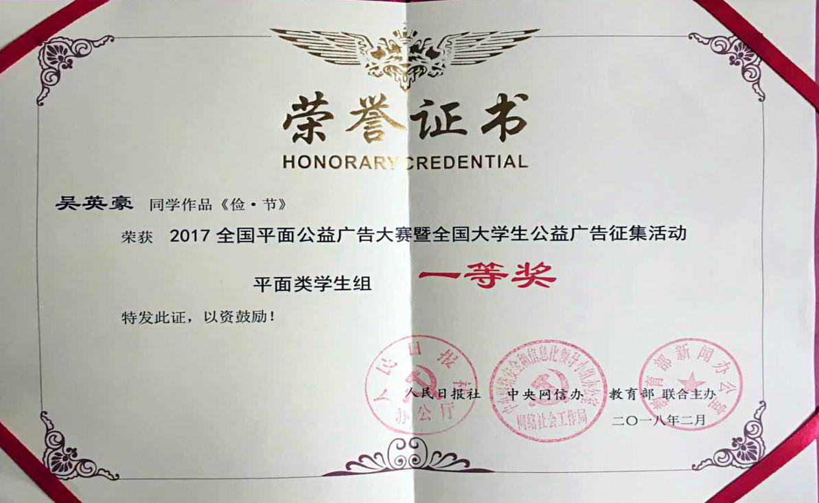 近日,第三届全国平面公益广告大赛最终评选结果出炉,艺术学院2014级视觉传达设计专业吴英豪(指导教师王海涛),从上万件参赛作品里脱颖而出,获得全国唯一一个一等奖,人民日报将辟专栏对获奖作品进行宣传报道。