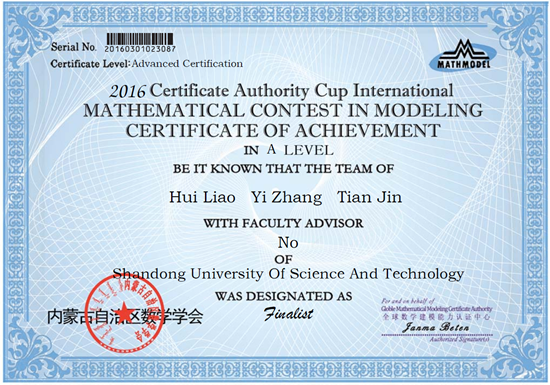 在第五届“认证杯”数学中国数学建模国际赛上,我院城乡规划2014级学生廖辉为负责人组成的代表队提交的作品《The prediction of ozone levels over the next 50 years》获大赛特等奖提名奖(Finalist),并被授予全球数学建模能力高级认证。