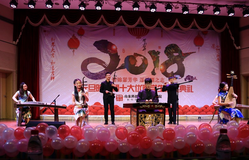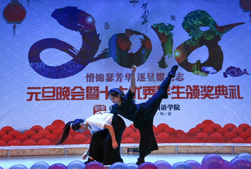 党委副书记马海超作了新年致辞,简要回顾总结了过去一年里的有关工作及取得的成就,表达了对外院莘莘学子殷切期盼,并向全体师生致以新年的祝福。晚会在大学生艺术团器乐队演奏的开场曲《奇迹》中拉开帷幕。晚会表演形式多样,内容丰富多彩、异彩纷呈,充分展现了外国语学院全体师生的热情与活力。王梦媛老师和2017级兼职辅导员表演了青春活力的《咖喱咖喱》,赢得了现场观众的热烈欢呼;外文剧团的话剧《吾心安处是吾乡》、学生会办公室的舞台剧《外院才艺show》、主持朗诵队的《错悔一生》,更是为大家带来了一场视听盛宴;2017级日语1班带来的小品《泰国风情餐厅》时时有笑点、处处有掌声;宋燕老师的《勇气》,曲琳、王博学的《势在必行》以及宋晓群、毛煜青等人带来的《我》&《红玫瑰》更是将晚会气氛推向高潮;在中场互动环节,台下观众们用一句句诗词表达对新年的美好愿望与祝愿。
