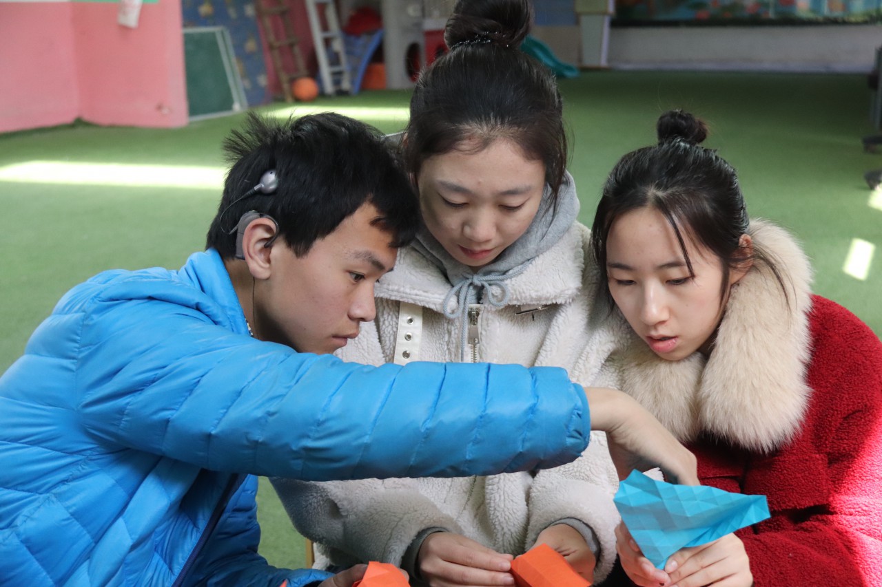 上午9:30,27名志愿者来到了黄岛区东方聋儿语训中心,他们的到来,受到了孩子们的热烈欢迎。根据实际情况,志愿者们分组行动,有的前往图书室,帮助孩子们整理书籍,有的陪着孩子踢球、折纸,丢沙包,做起了各类文娱活动。就这样,孩子们很快度过了生疏期,爽朗的笑声充斥着教室和操场的每个角落。作为大哥哥、大姐姐,志愿者们不仅担负着陪伴的义务,他们还十分细心的挖掘着孩子们的优点,鼓励孩子们发展自己的特长,做引导孩子们成长的小导师。还把自己先前折好的折纸送给了孩子们留作纪念。在一片欢生笑语中,志愿者和孩子们留下了温暖的剪影。