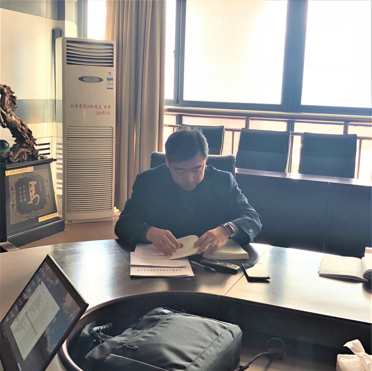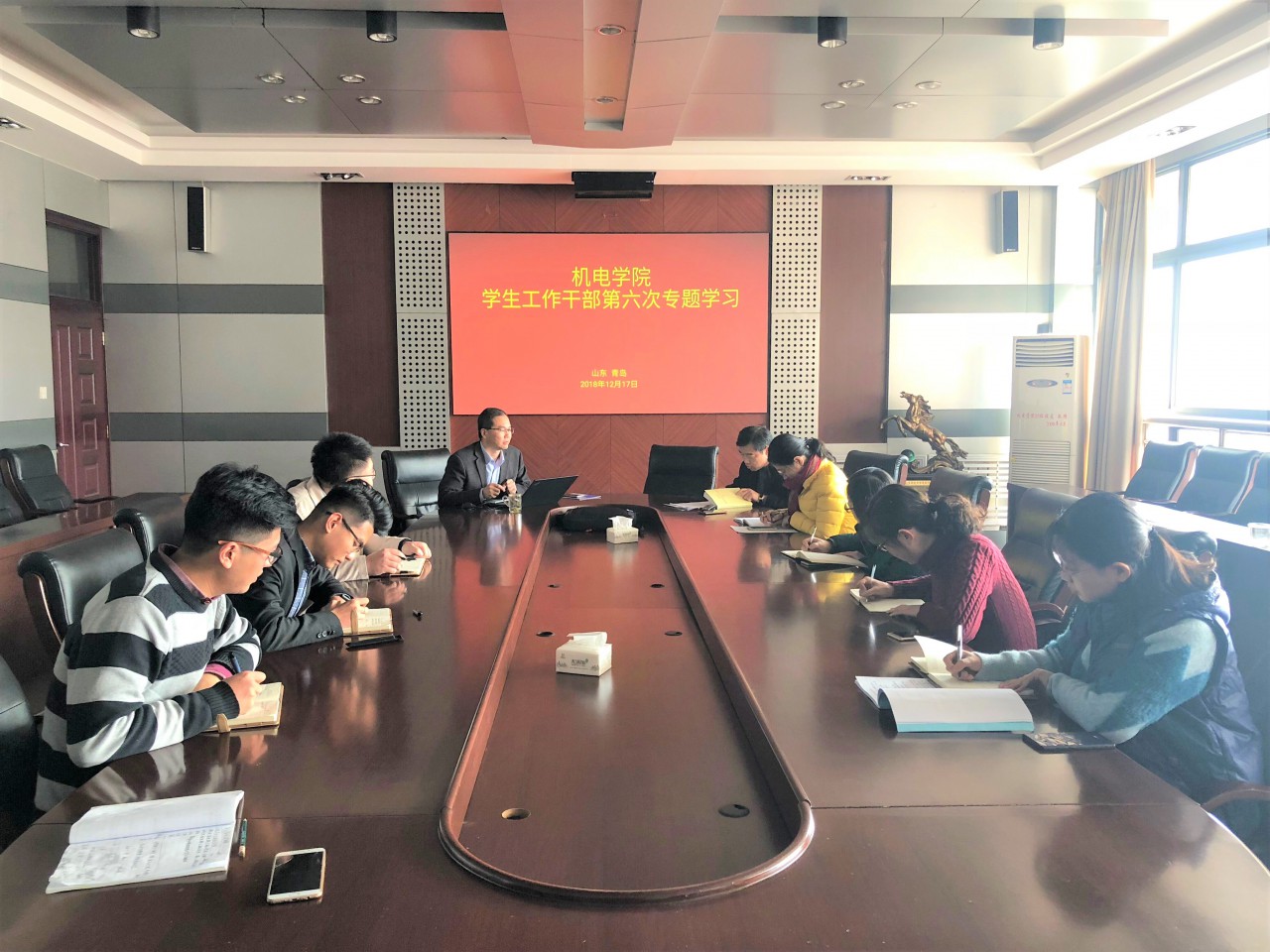 会议伊始,靳凯老师带领大家共同学习了《习近平新时代中国特色社会主义思想三十讲》的第二十九讲——“努力掌握马克思主义思想方法和工作方法”,既要全面准确领会马克思主义的丰富内涵、思想体系和实践要求,又要深刻把握贯穿其科学思想方法和工作方法,不断提高攻坚克难、化解矛盾、驾驭复杂局面的能力,在新时代更好地坚持和发展中国特色社会主义。随后,靳凯又带领大家学习了《中共中央国务院关于全面深化新时代教师队伍建设改革的意见》,樊玉华老师带领大家学习了《关于深化高等学校岗位管理制度改革的若干意见》。紧接着,樊玉华老师就前期外出培训学习的内容进行了汇报交流。最后,苗汝昌带领大家就共青团考核、就业跟踪等工作进行了专门研讨,并就所学内容对大家提出了四点要求:一是坚持问题导向和目标导向,用马克思主义的方法指导日常工作,切实落实实践育人的工作目标;二是端正态度,强调态度的重要性,要把培养学生当成自己一份真正的事业,时刻坚守育人初心;三是要本着永争第一的工作理念,努力做好学生工作,敢于动脑,勇于创新,共创机电辉煌;四是要求大家梳理各方面工作,不断完善工作体系,扎实做好学团工作。