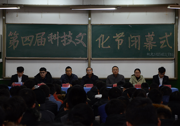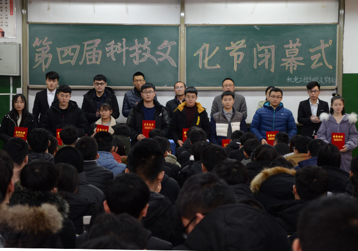 12月27日,机电系在2#401召开机电系第四届大学生科技文化节闭幕式暨表彰大会,会议由机电系学生会主席杜震主持,机电系团总支书记谢清勇,辅导员王衍国、刘钦兴、郭艳培、张乾,获奖代表,科联全体成员及各班科技委员参加。