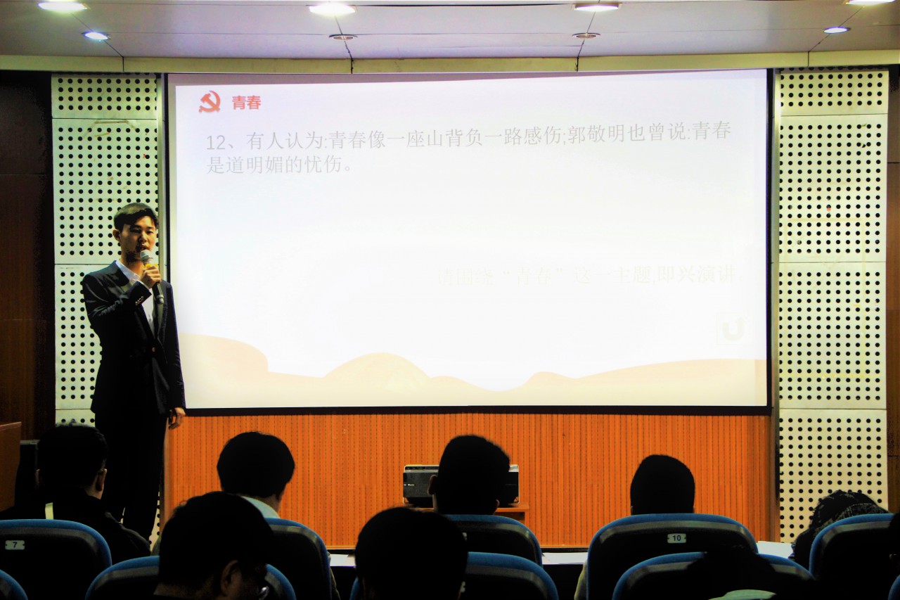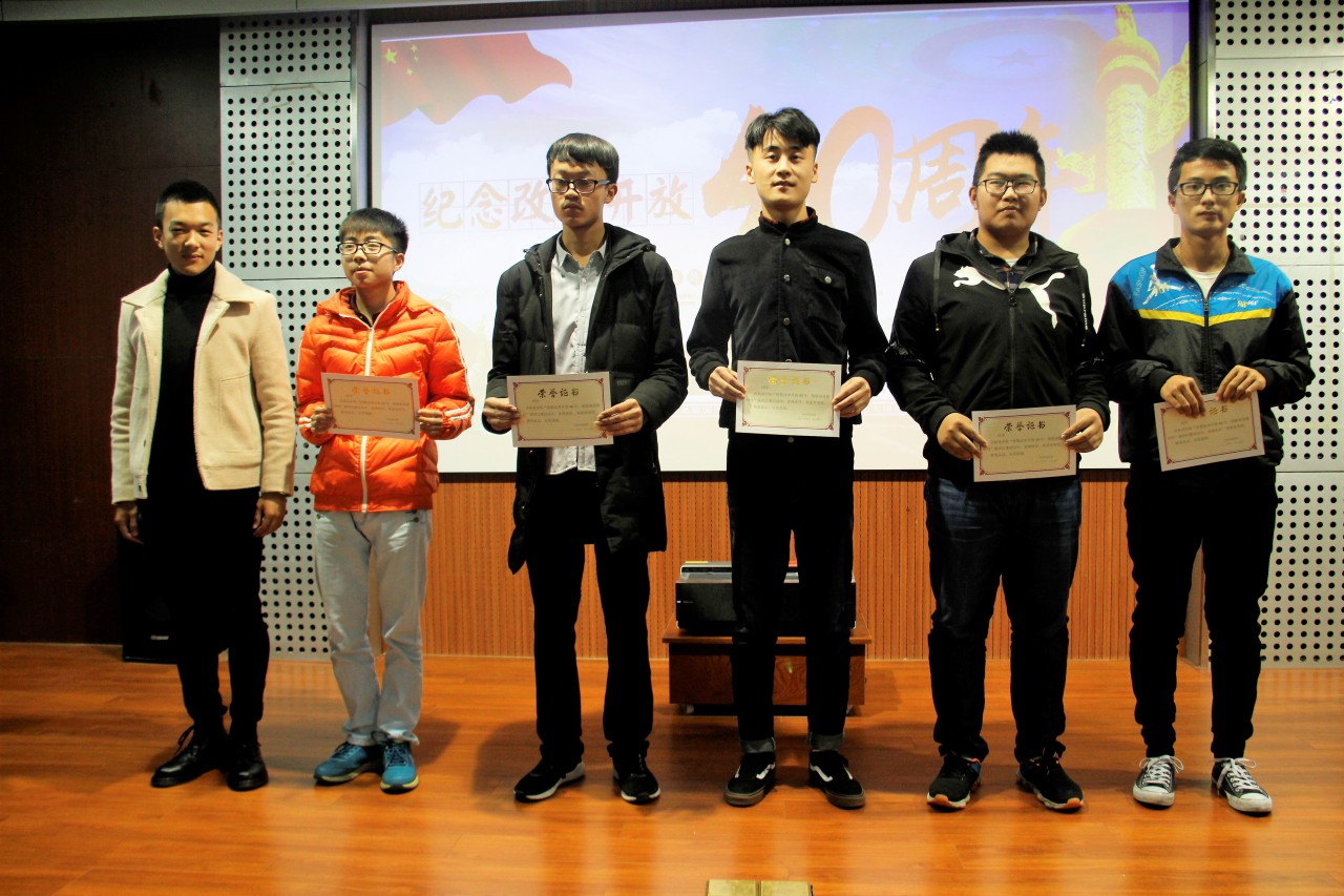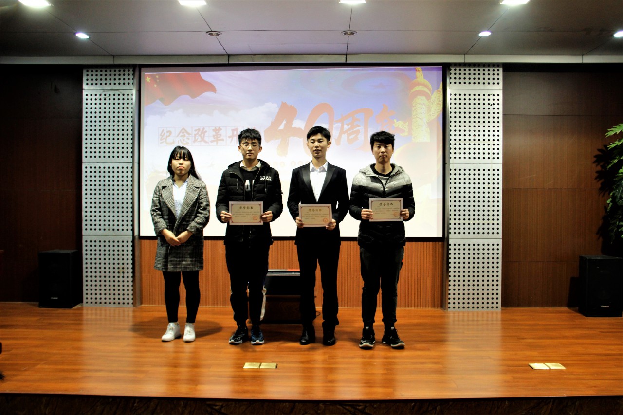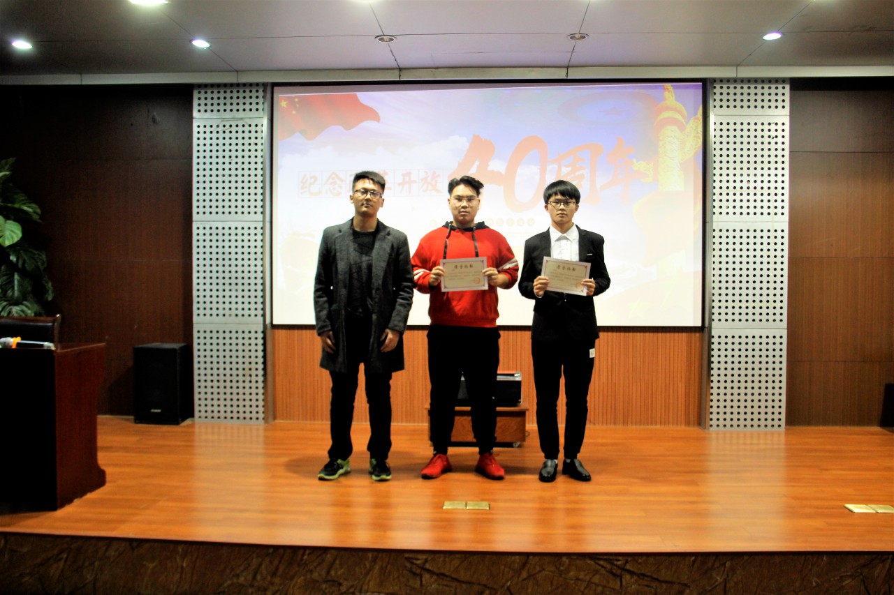 经过初赛的激烈角逐,共有18名选手进入决赛。主持人宣读开幕词后,比赛正式开始。首先进行的是第一环节主题演讲,参赛选手意气风发,激情昂扬,从身边有关改革开放的点滴出发,滔滔不绝地诉说着“我与改革开放”的故事。每位选手演讲主题鲜明,内容丰富充实,见解独到,把改革开放的故事分享给评委和观众。第二环节答题定序考验的是每个选手对国家历史的了解程度,选手们对所出问题对答如流,不差分毫。最后一个环节,参赛选手随机抽取话题,对所抽取的话题即兴发挥,选手们机智灵活,见经识经,把自己所选的话题生动形象的展示给了评委和观众。台下的评委和观众用心聆听着选手们的演讲,同时对他们的优秀表现表示肯定,不时地发出阵阵掌声。最终,经过决赛的激烈比拼,机电18-4班辛嘉铭和能源18-3班王汶康脱颖而出,获得一等奖!