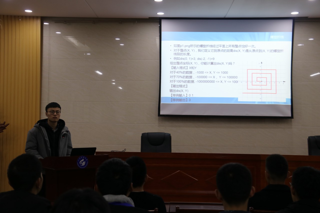 交流会开始,孙启恒首先向大家介绍了C/C++程序设计大赛命题范围以及涉及的其它知识,C++、STL、数据结构以及算法等,并具体解释了二分、搜索(宽度优先,广度优先)、暴力、贪心这四种算法,告知大家“蓝桥杯”大赛题目是在这四种算法基础上演变而来的。随后,他还向大家推荐了浙江大学的MOOC、《算法竞赛入门经典》、以及vjudge.net学习平台供参赛选手们学习。接着,孙启恒解析了去年大赛的题目,从螺旋折线、次数统计、递增三元组等几个题型深入展开。