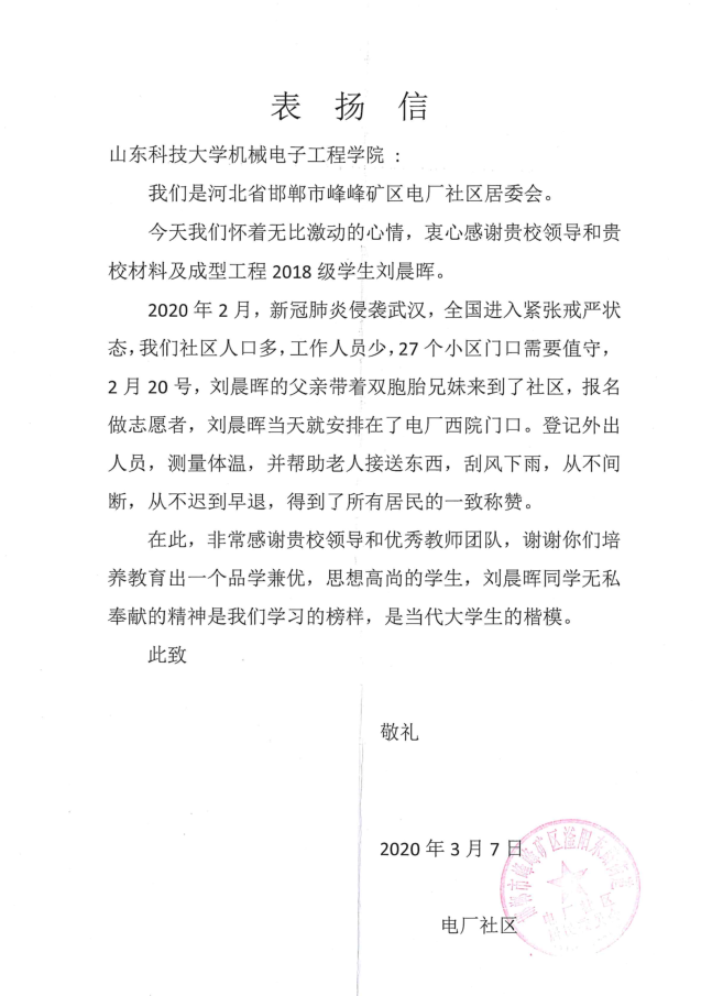 近日,taptap点点体育机械电子工程学院收到来自河北省邯郸市峰峰矿区电厂社区居委会对学院材料成型与控制工程专业2018级学生刘晨晖参与疫情防控志愿服务活动的表扬信。