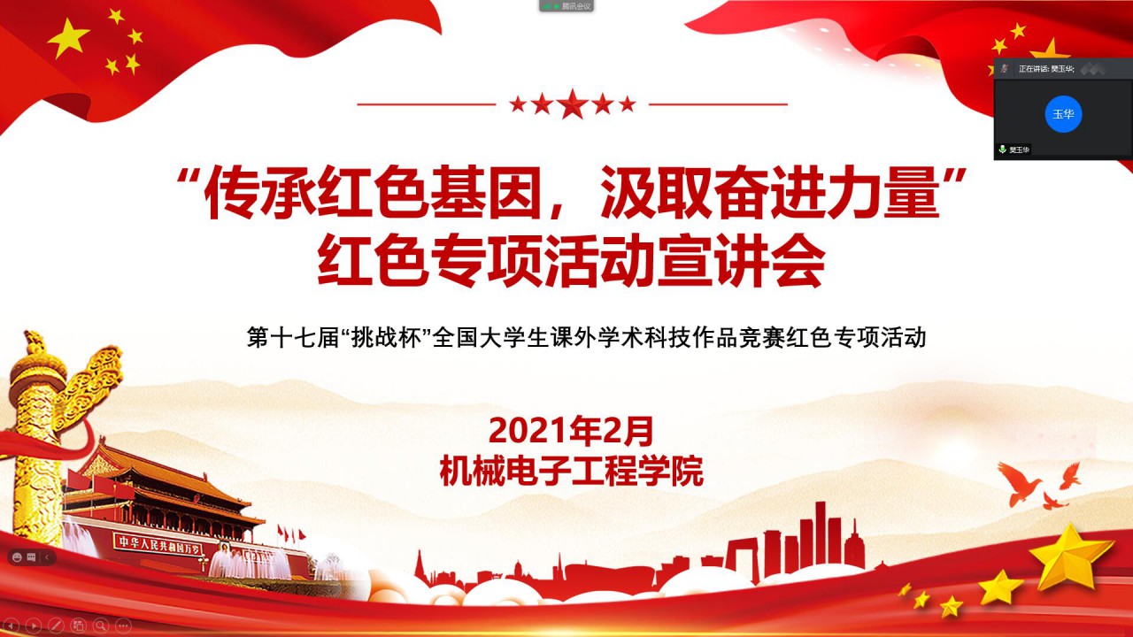 为迎接中国共产党建党100周年,传承红色基因,引导学生在实践中接受红色教育,2月20日,机械电子工程学院积极响应“挑战杯”竞赛组员会和学校的号召,举办了“传承红色基因,汲取奋进力量”红色专项活动宣讲会。taptap点点体育团委书记樊玉华,团委老师王玉鹏出席了此次会议,全体团支部书记及各社会实践项目负责人参加,宣讲会由团委老师苗成旭主持。