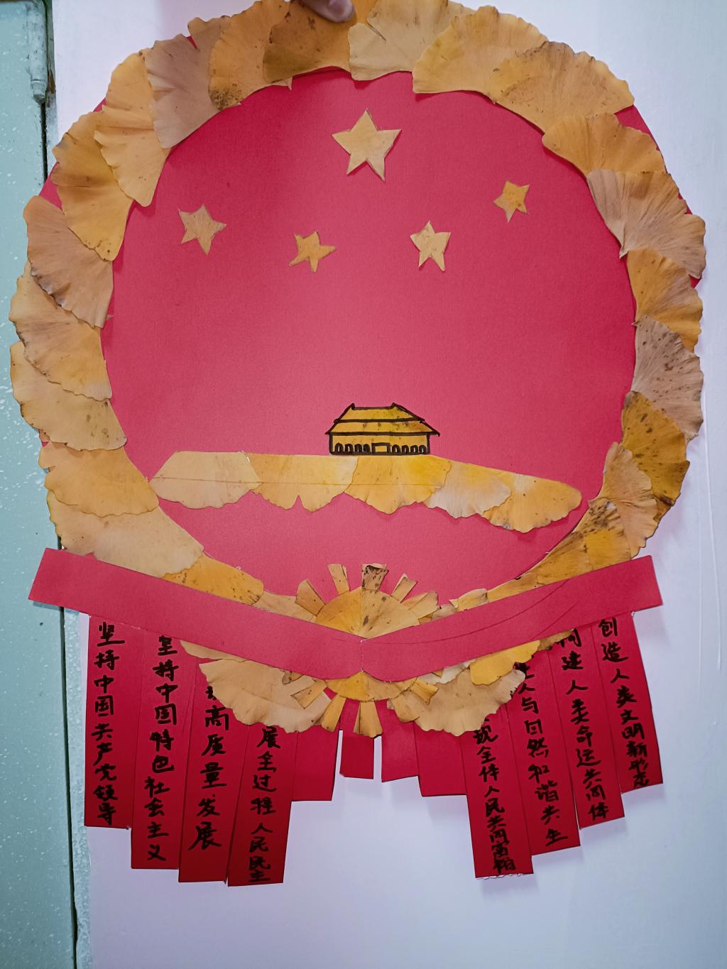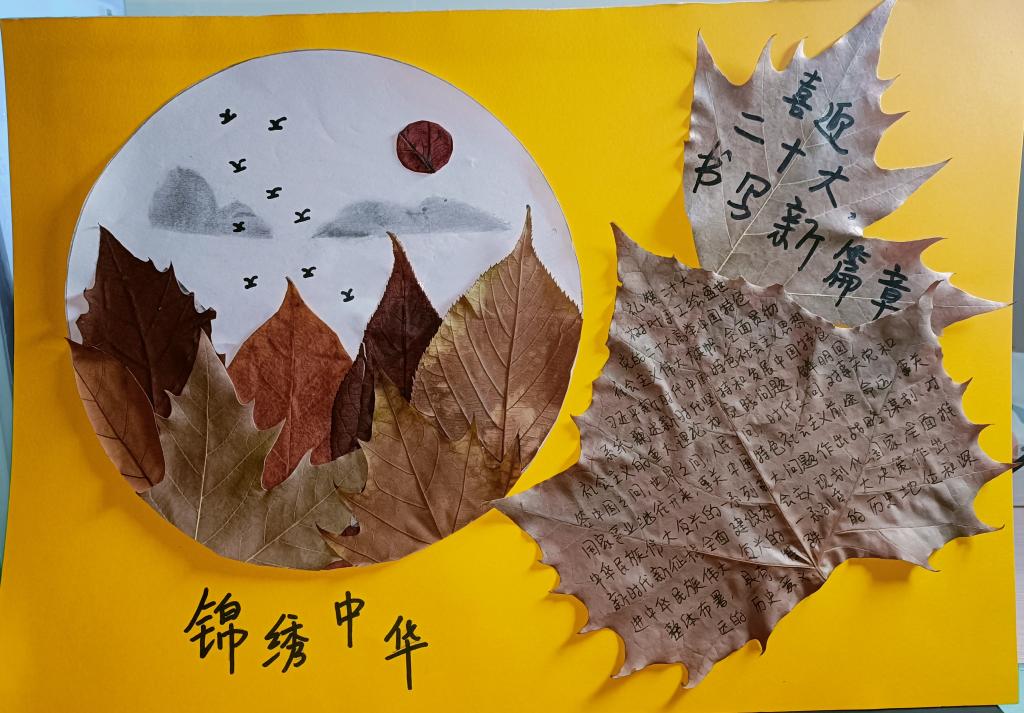“一年好景君须记,正是橙黄橘绿时”,片片树叶离开了树枝的“牵挂”、飘落在地,同学们通过粘、剪、画相结合的方法创造出了一幅幅精美的树叶粘贴画,并将党的二十大报告金句写在树叶粘贴画上,通过喜闻乐见的活动方式,让党的二十大精神入脑入心,同时也为学校增添一道亮丽的风景。