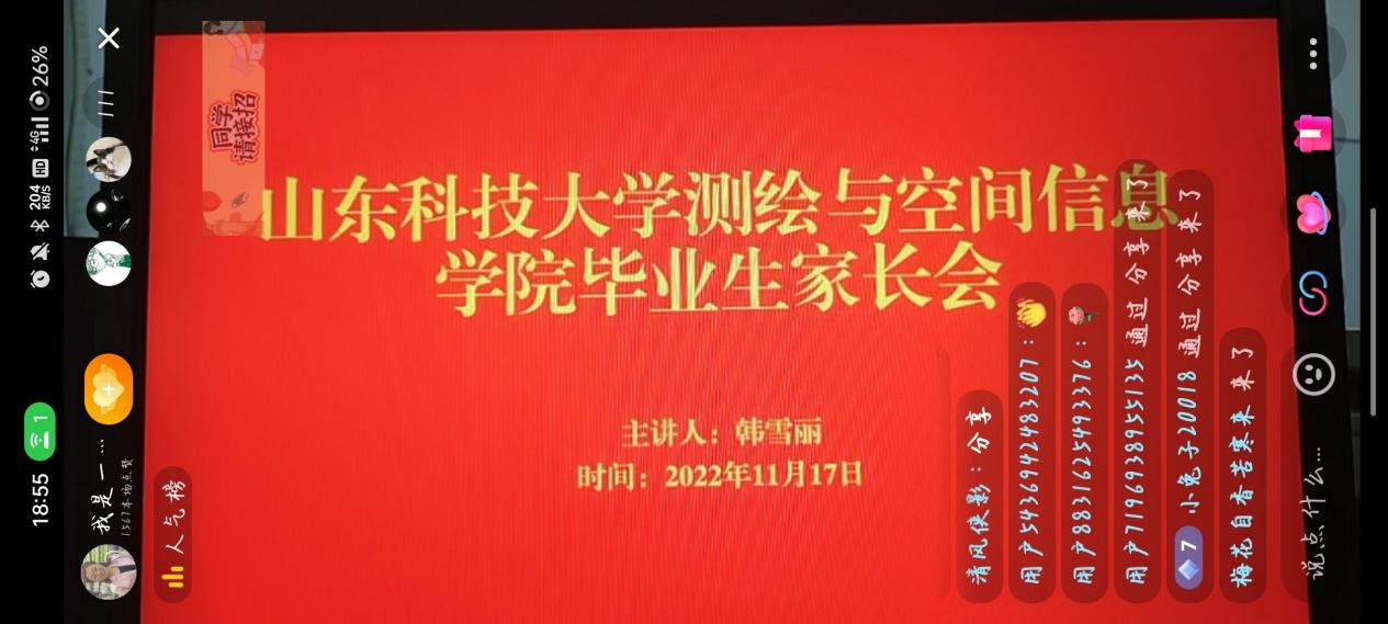 11月18日晚,测绘与空间信息学院利用抖音直播组织召开了23届毕业生就业主题家长会,本次家长会有400余名家长参加,会议由毕业生辅导员韩雪丽作为主讲,党委副书记吴昊、团委书记孙金香及毕业生辅导员韩冰、周静宜参会并在线交流解答问题。
