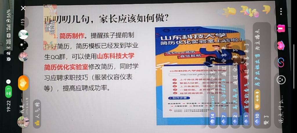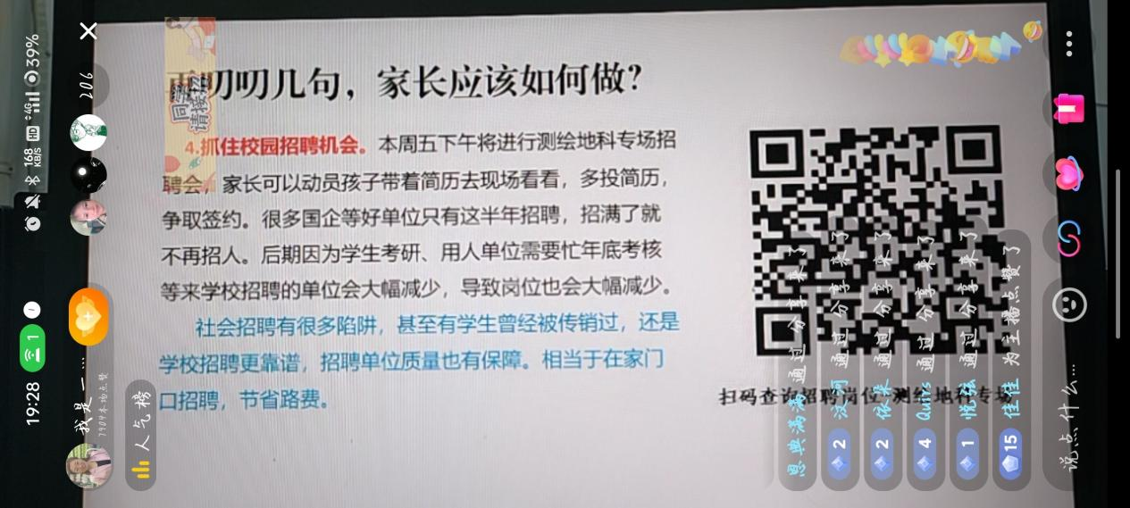直播开始后,韩雪丽针对就业毕业去向分类及界定标准、测绘学院往年各专业就业方向及单位情况进行了展示与分析,讲解了应征入伍、大学生志愿服务西部计划等就业优惠政策及优势。然后从面对疫情反复、经济下行压力、严峻复杂国际形势叠加影响、供给与需求不平衡等方面对大学生就业现状进行了分析,并提出应对措施。最后,建议各位家长转变择业观念,引导毕业生理性分析,合理选择,珍惜就业机会,尽早就业。直播结束后,韩雪丽针对各位家长提出的问题进行答疑互动交流。